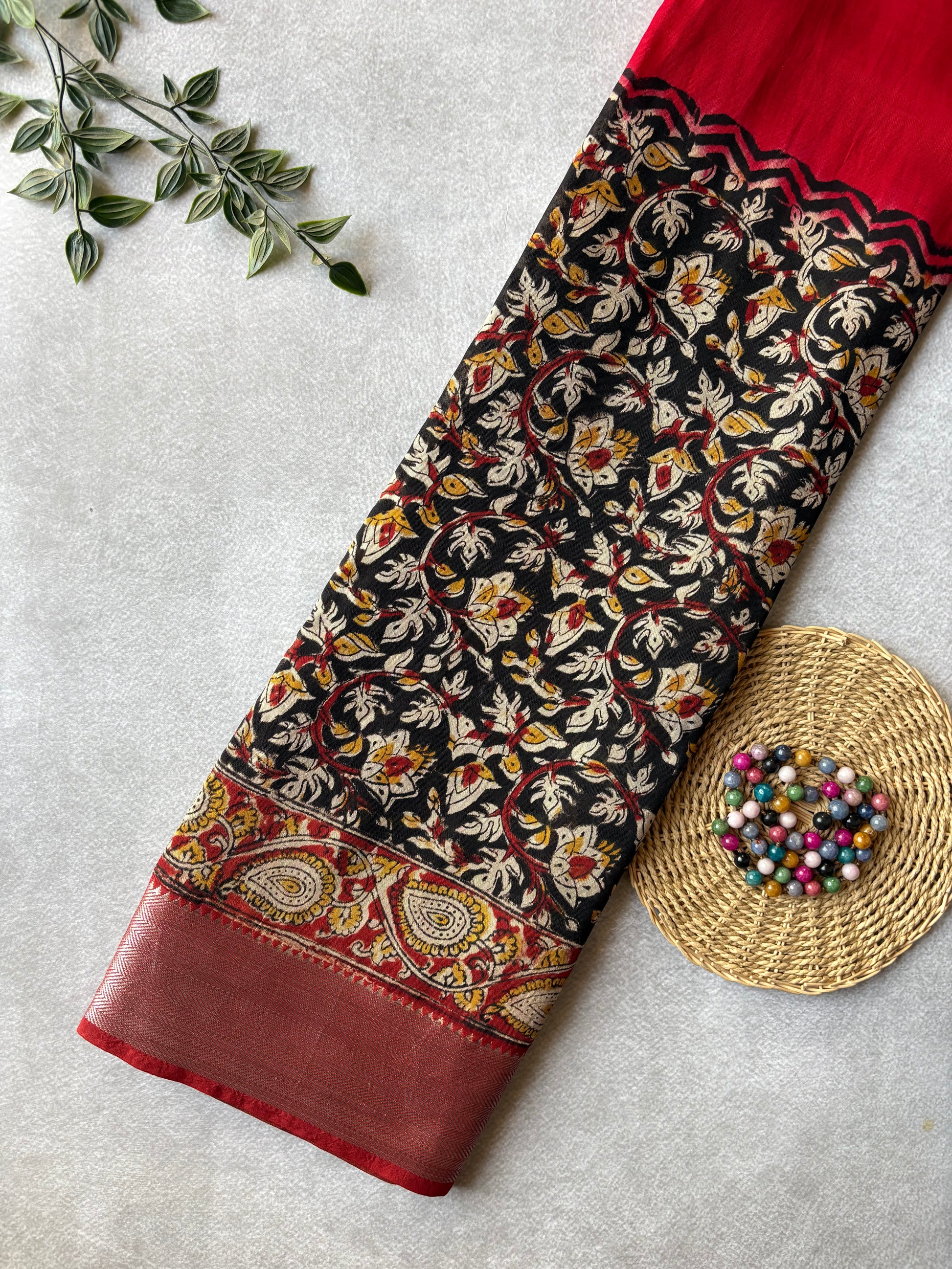 Our Kalamkari Chennur Silk Sarees are timeless works of art, handcrafted with love and skill. This half and half saree features a rich black floral handblock Kalamkari design paired with an elegant red Chennur silk body. Soft, lustrous, and gracefully draped - perfect for festive occasions, poojas, or adding a touch of tradition to your everyday style.