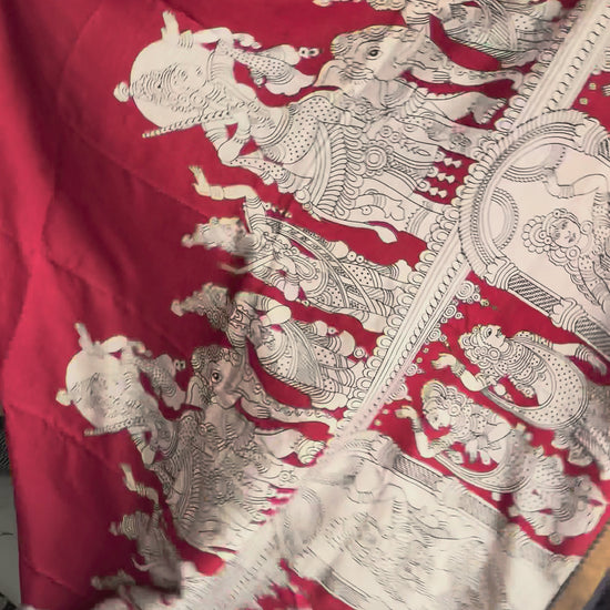 Our Kalamkari Chennur Silk Sarees are timeless pieces of wearable art, handcrafted with love and skill. Each saree tells a story inspired by Indian mythology, nature, and tradition  brought to life by artisans using intricate hand-drawn Kalamkari techniques.