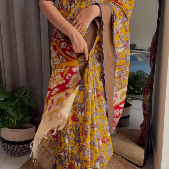 Our Kalamkari Chennur Silk Sarees are timeless pieces of wearable art, handcrafted with love and skill. Each saree tells a story inspired by Indian mythology, nature, and tradition brought to life by artisans using intricate hand-drawn Kalamkari techniques.