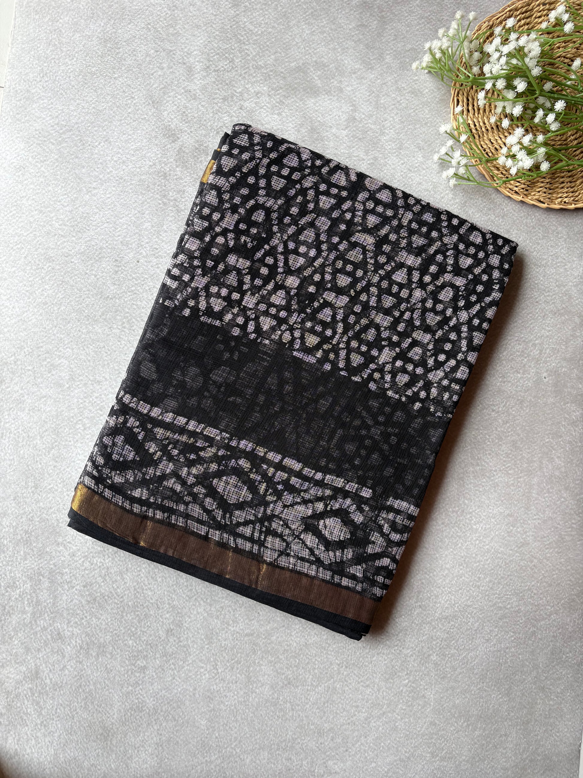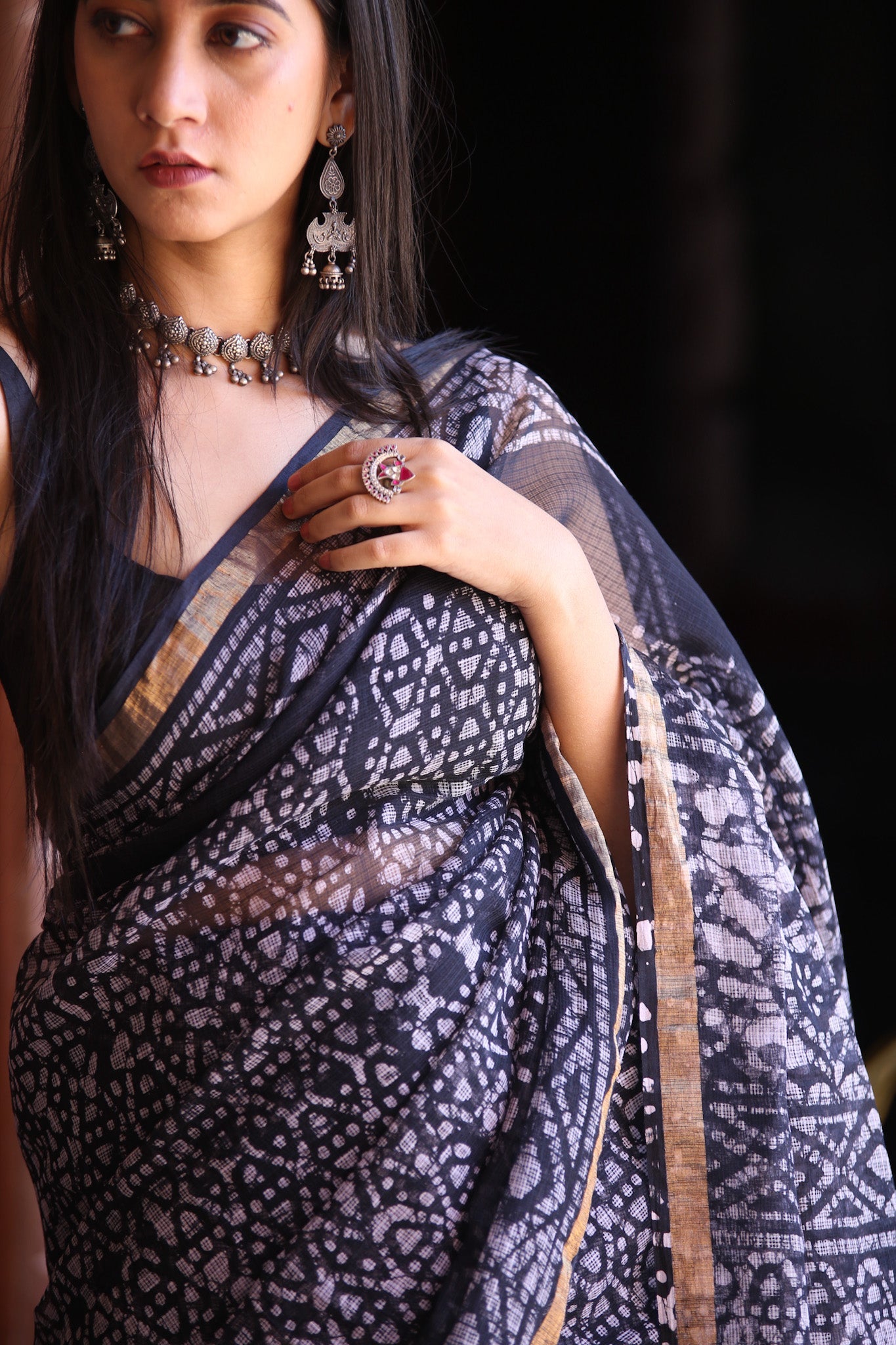 Presenting our Kota Doria saree—a lightweight, sheer garments originating from Kota, Rajasthan, known for their fine cotton-silk blend, distinctive checkered "Khat" pattern, and breathability, making them ideal for warm climates and casual or festive wear. Handcrafted by skilled artisans, this saree showcases the rich legacy of Indian craftsmanship through its intricate Bagru handblock prints. Celebrate the enduring beauty of Bagru handblock prints and elevate your style with this exquisite creation.
