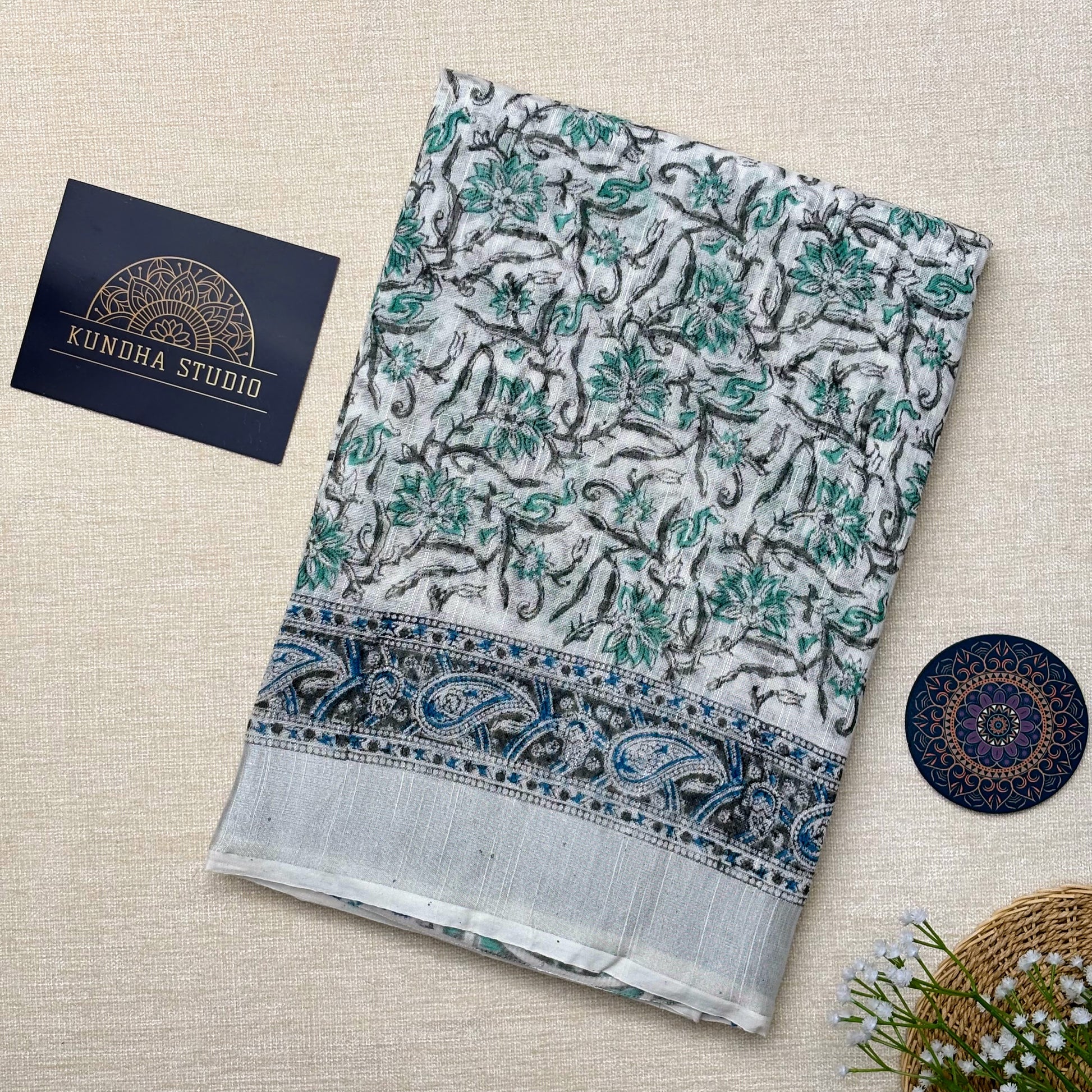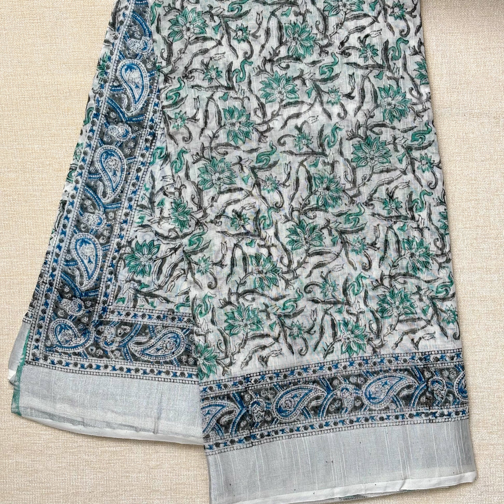 Linen Cotton Block print - White & Green