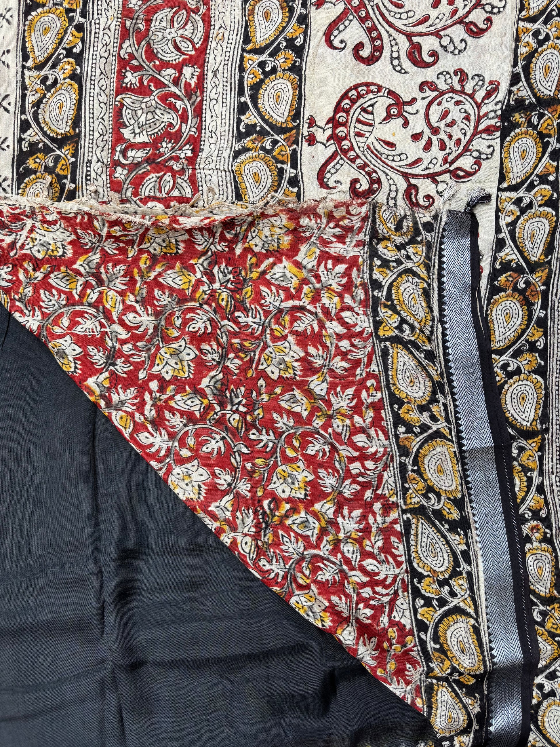 Our Kalamkari Chennur Silk Sarees are timeless works of art, handcrafted with love and skill. This half and half saree features a rich maroon floral handblock Kalamkari design paired with an elegant black Chennur silk body. Soft, lustrous, and gracefully draped - perfect for festive occasions, poojas, or adding a touch of tradition to your everyday style.